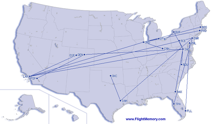 | Vol le plus court: | 109 mi, 1:09 h, Los Angeles (International) - Palm Springs (International), 03-23-2026 |