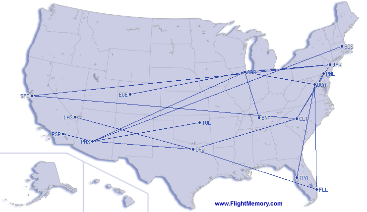 | Kortste vlucht: | 260 mi, 0:58 h, Phoenix (Sky Harbor) - Palm Springs (International), 02-19-2026 |