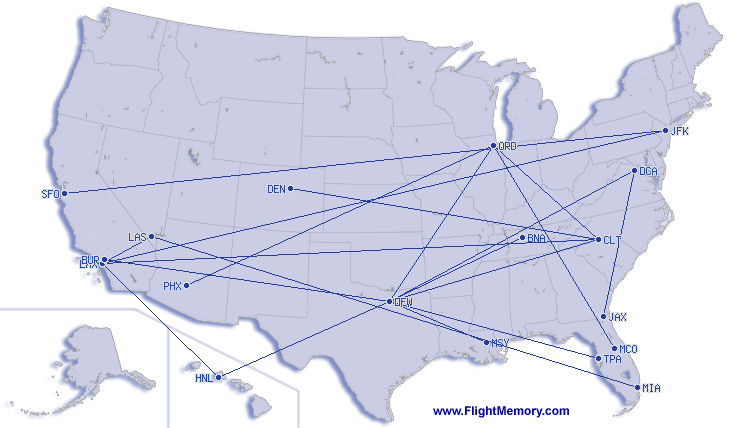 | Najkrótszy lot: | 237 mi, 0:55 h, Las Vegas (Harry Reid International) - Los Angeles (International), 03-19-2026 |
