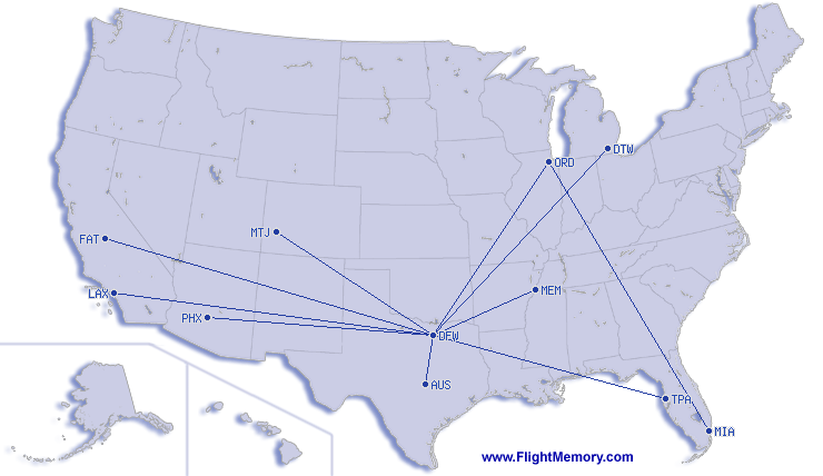 | Najkraci let: | 190 mi, 1:22 h, Austin (Bergstrom International) - Dallas/Fort Worth (International), 02-22-2026 |