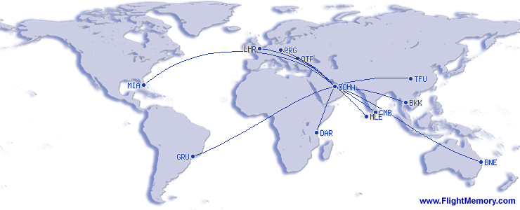| Längsta flygsträcka: | 7,676 mi, 13:45 h, Miami (International) - Doha (Hamad International), 01-03-2026 |